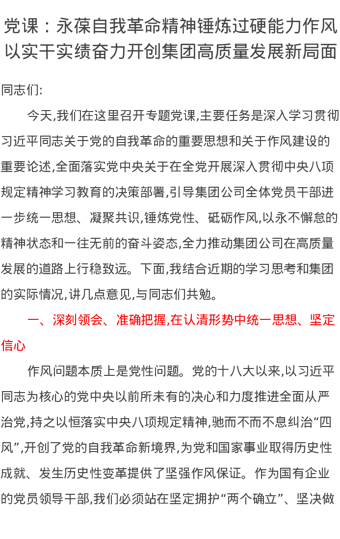 党课讲稿:永葆自我革命精神锤炼过硬能力作风以实干实绩奋力开创集团高质量发展新局面