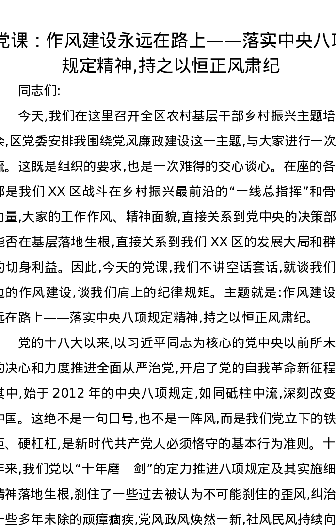 党课讲稿:作风建设永远在路上——落实中央八项规定精神,持之以恒正风肃纪