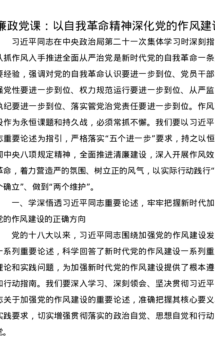 廉政党课讲稿:以自我革命精神深化党的作风建设
