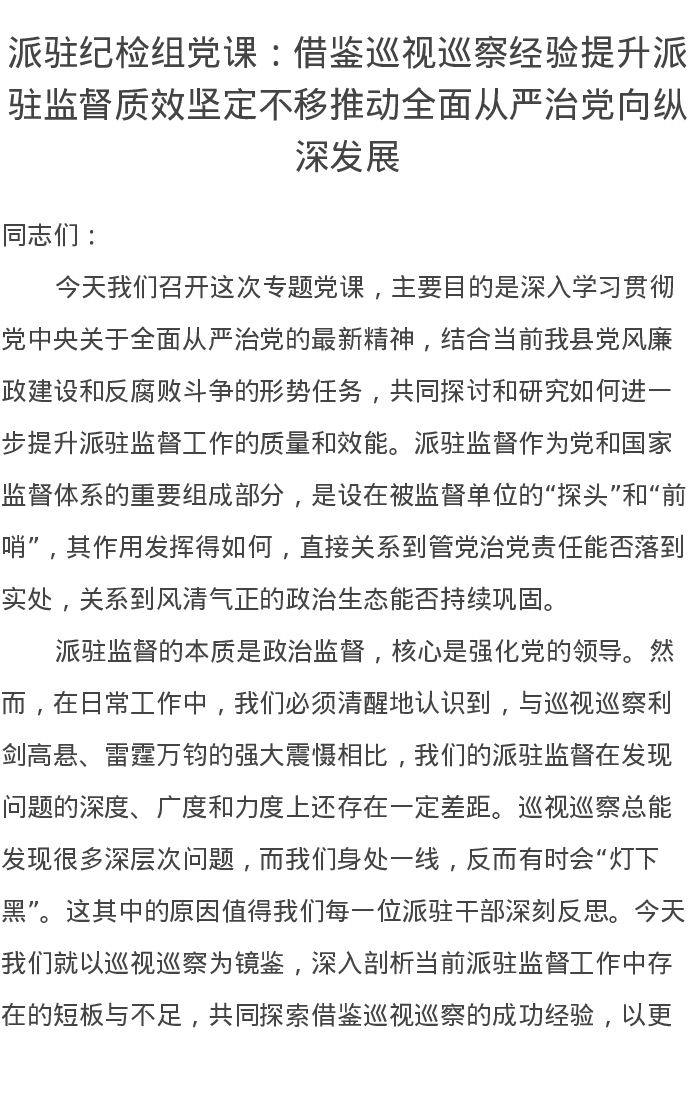 派驻纪检组党课讲稿:借鉴巡视巡察经验提升派驻监督质效坚定不移推动全面从严治党向纵深发展