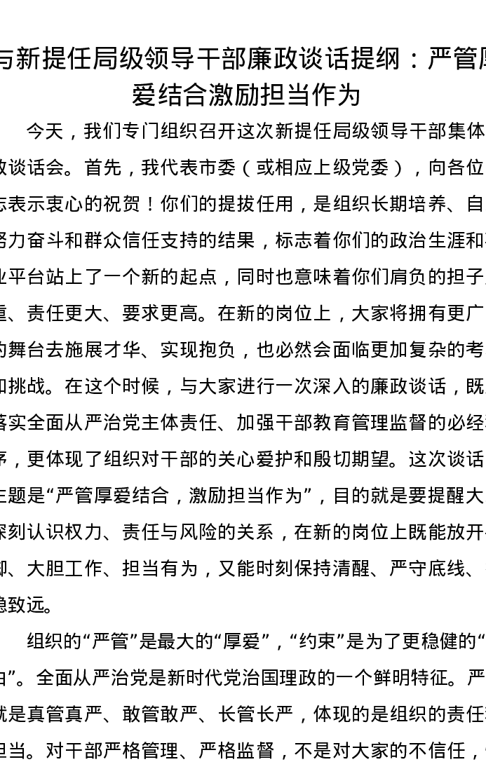 与新提任局级领导干部廉政谈话提纲:严管厚爱结合 激励担当作为