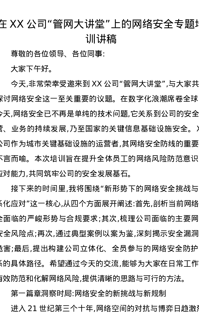 在XX公司“管网大讲堂”上的网络安全专题培训讲稿
