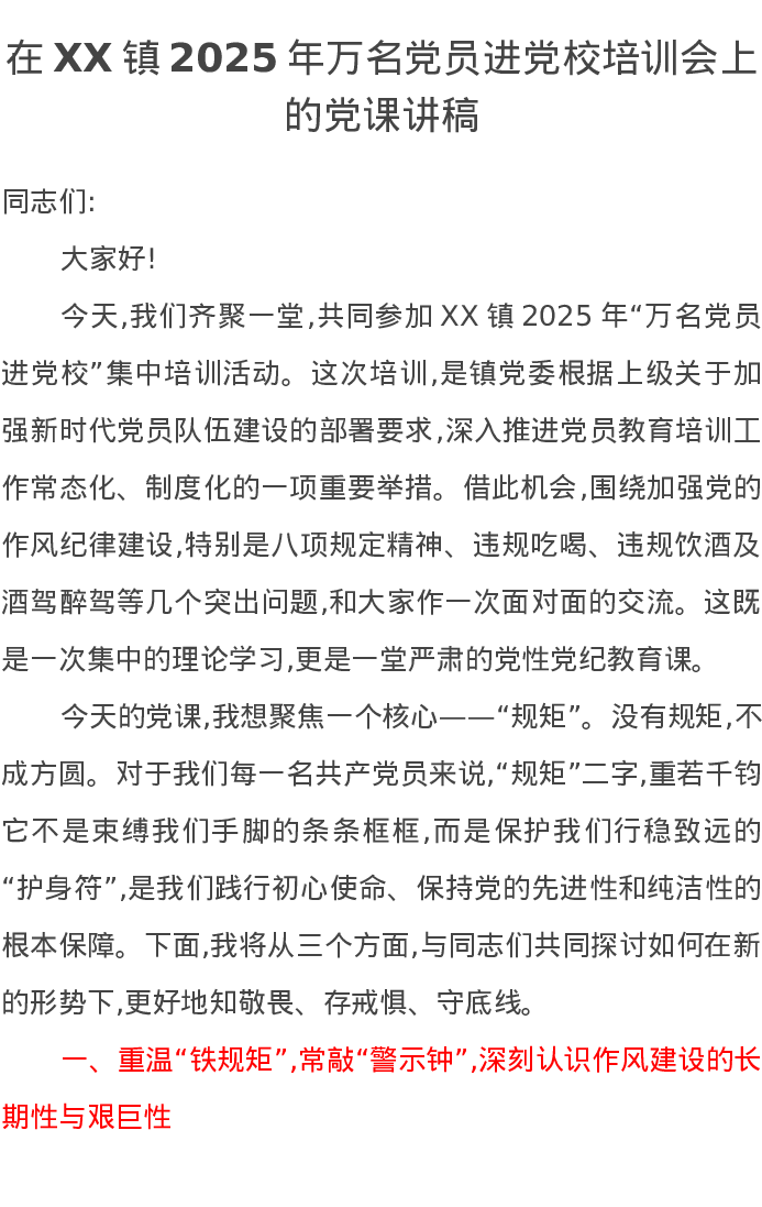 在XX镇2025年万名党员进党校培训会上的党课讲稿