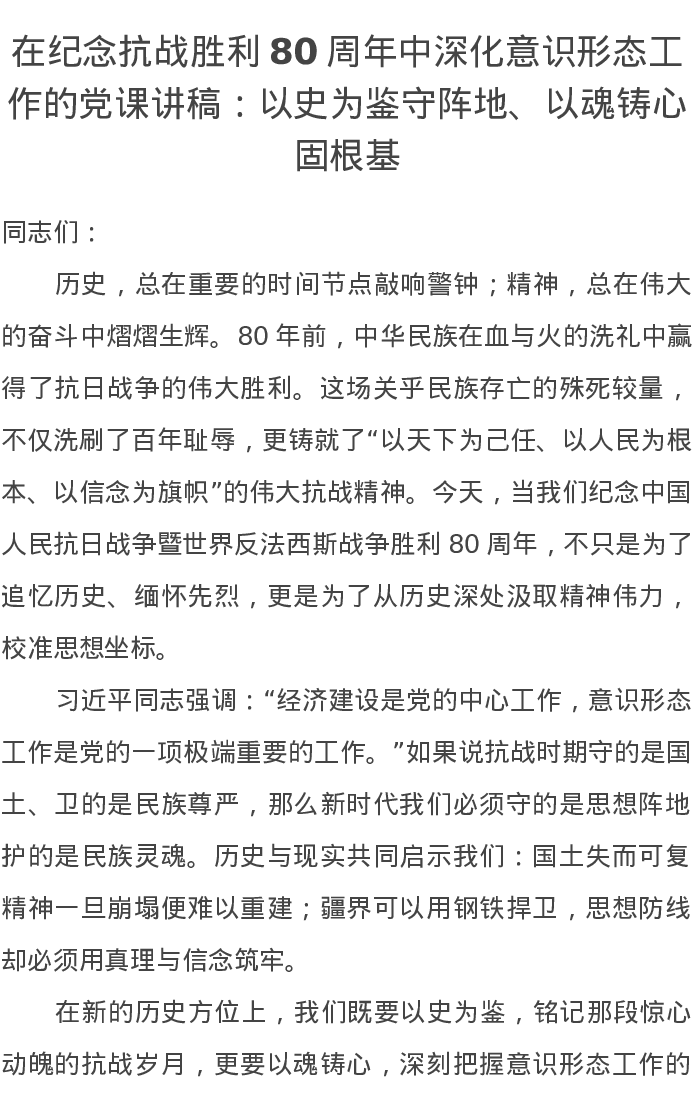 在纪念抗战胜利80周年中深化意识形态工作的党课讲稿:以史为鉴守阵地、以魂铸心固根基