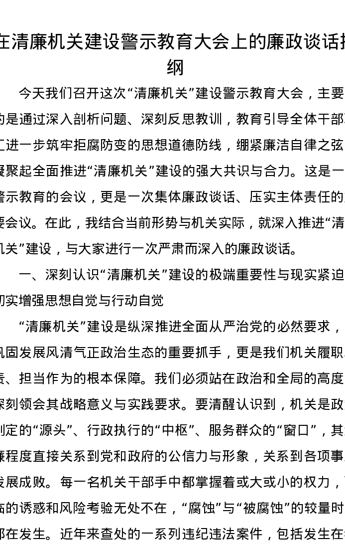 在清廉机关建设警示教育大会上的廉政谈话提纲