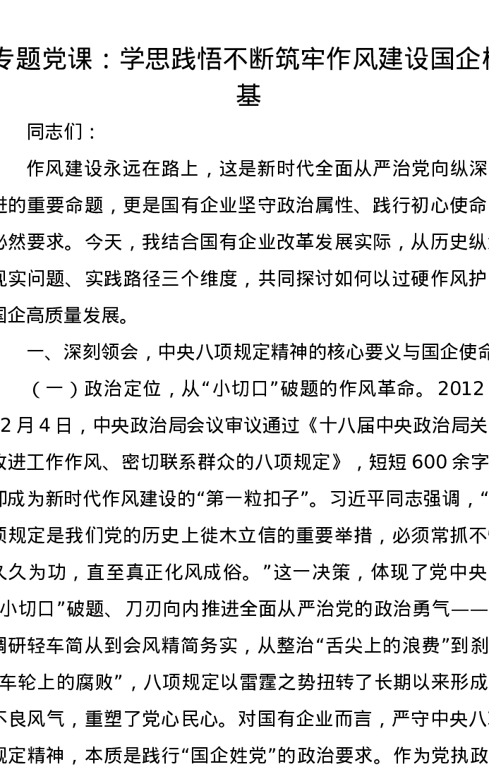 专题党课讲稿:学思践悟 不断筑牢作风建设国企根基