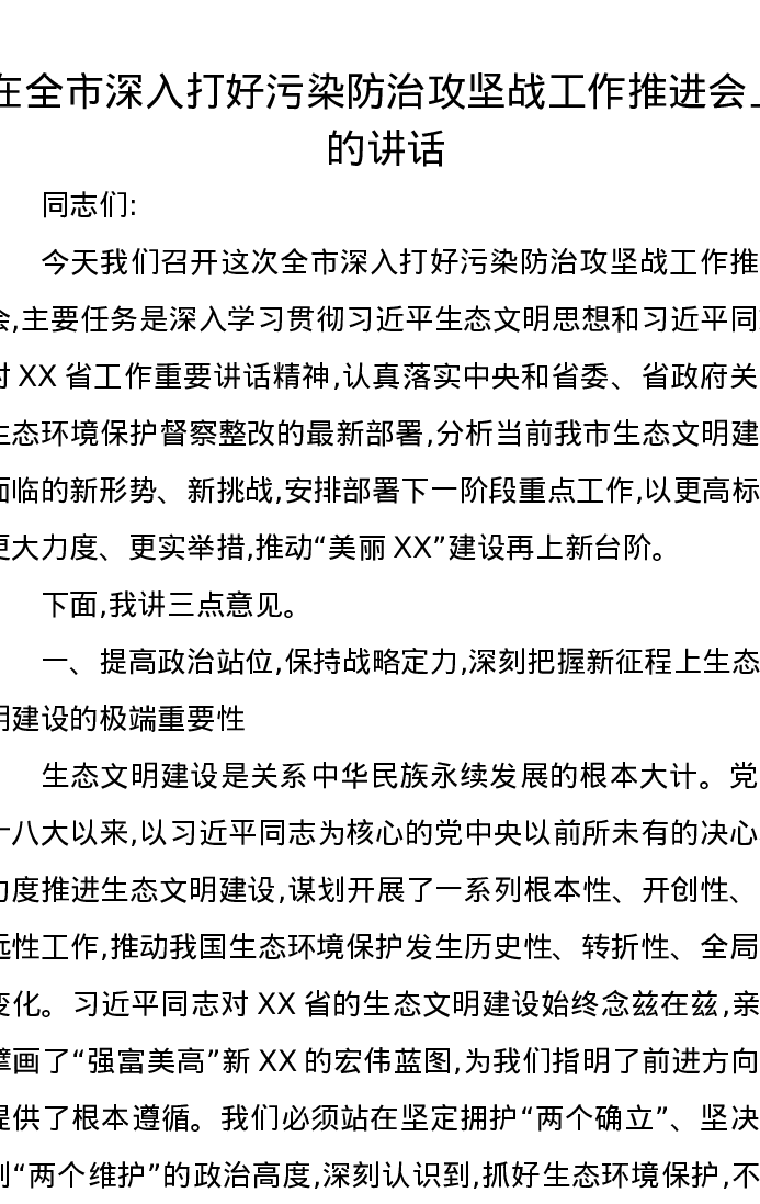 在全市深入打好污染防治攻坚战工作推进会上的讲话