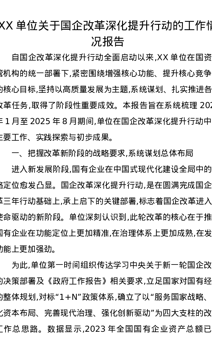 XX单位关于国企改革深化提升行动的工作情况报告