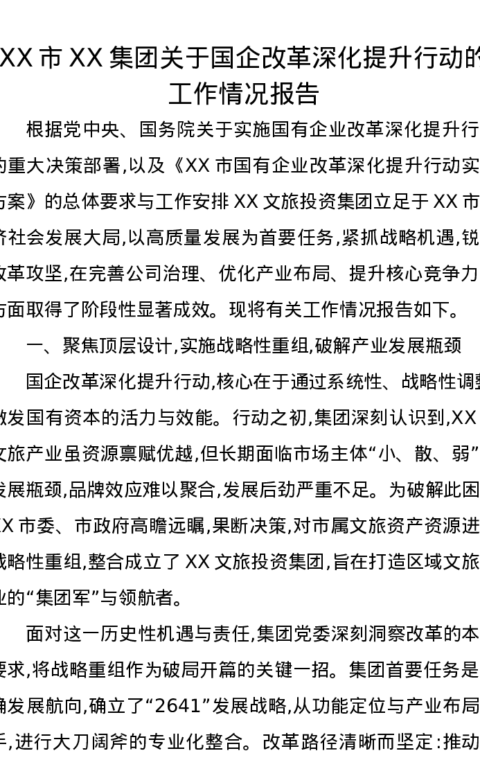 XX市XX集团关于国企改革深化提升行动的工作情况报告