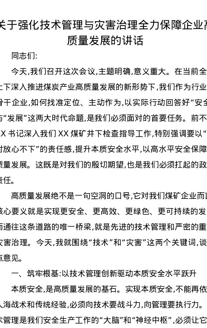 关于强化技术管理与灾害治理全力保障企业高质量发展的讲话
