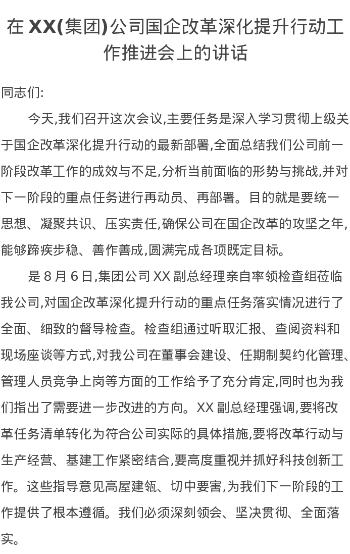 在XX(集团)公司国企改革深化提升行动工作推进会上的讲话