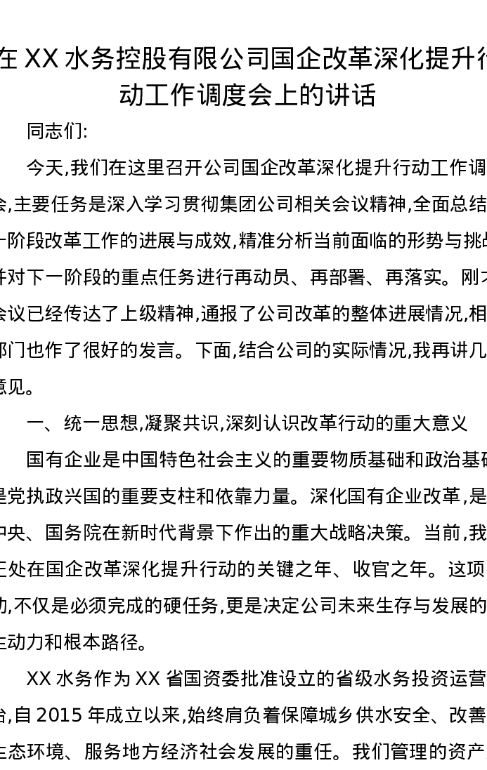 在XX水务控股有限公司国企改革深化提升行动工作调度会上的讲话