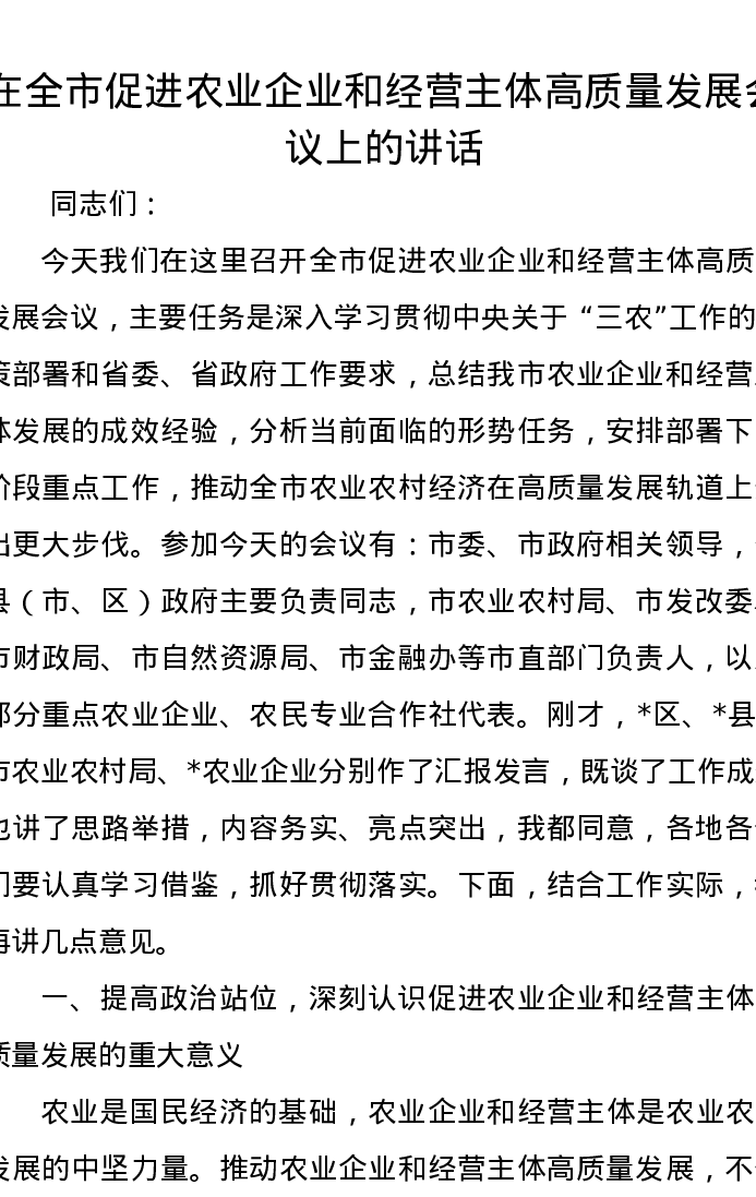 在全市促进农业企业和经营主体高质量发展会议上的讲话
