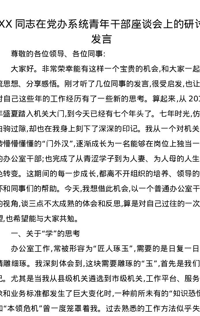 XX同志在党办系统青年干部座谈会上的研讨发言