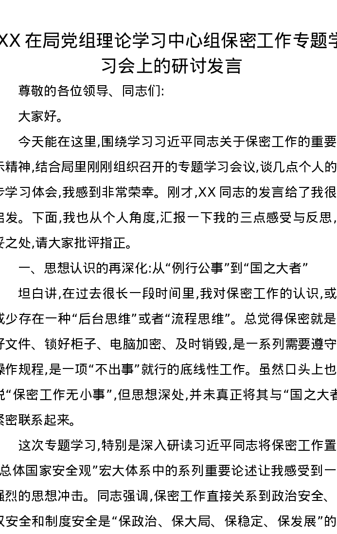 XX在局党组理论学习中心组保密工作专题学习会上的研讨发言