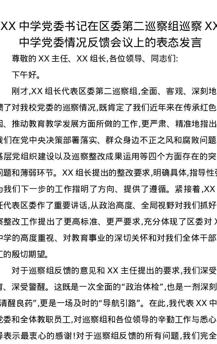 XX中学党委书记在区委第二巡察组巡察XX中学党委情况反馈会议上的表态发言