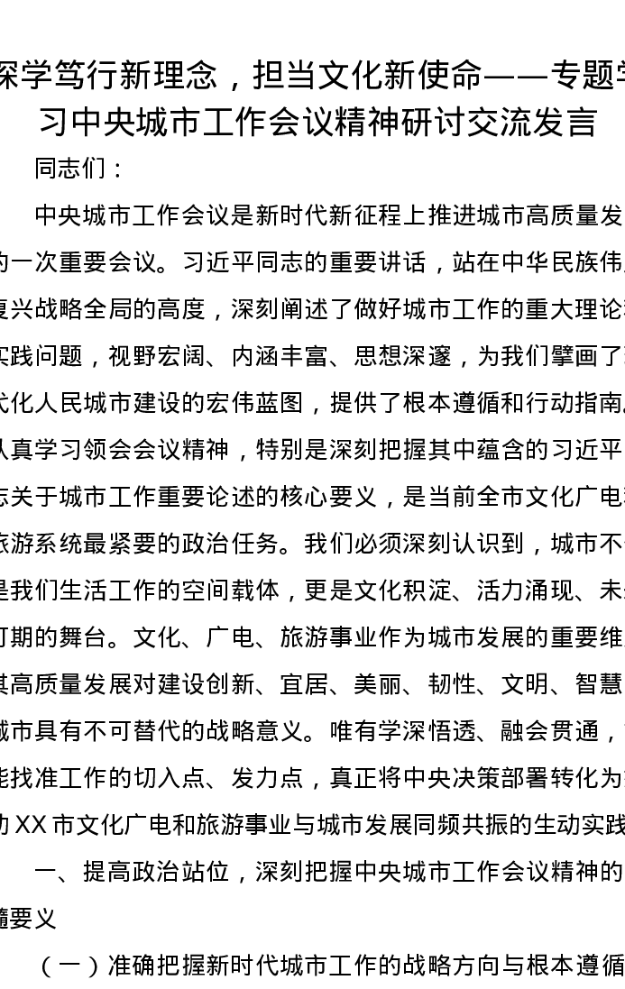 深学笃行新理念,担当文化新使命——专题学习中央城市工作会议精神研讨交流发言