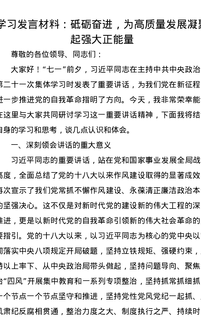 学习发言材料:砥砺奋进,为高质量发展凝聚起强大正能量