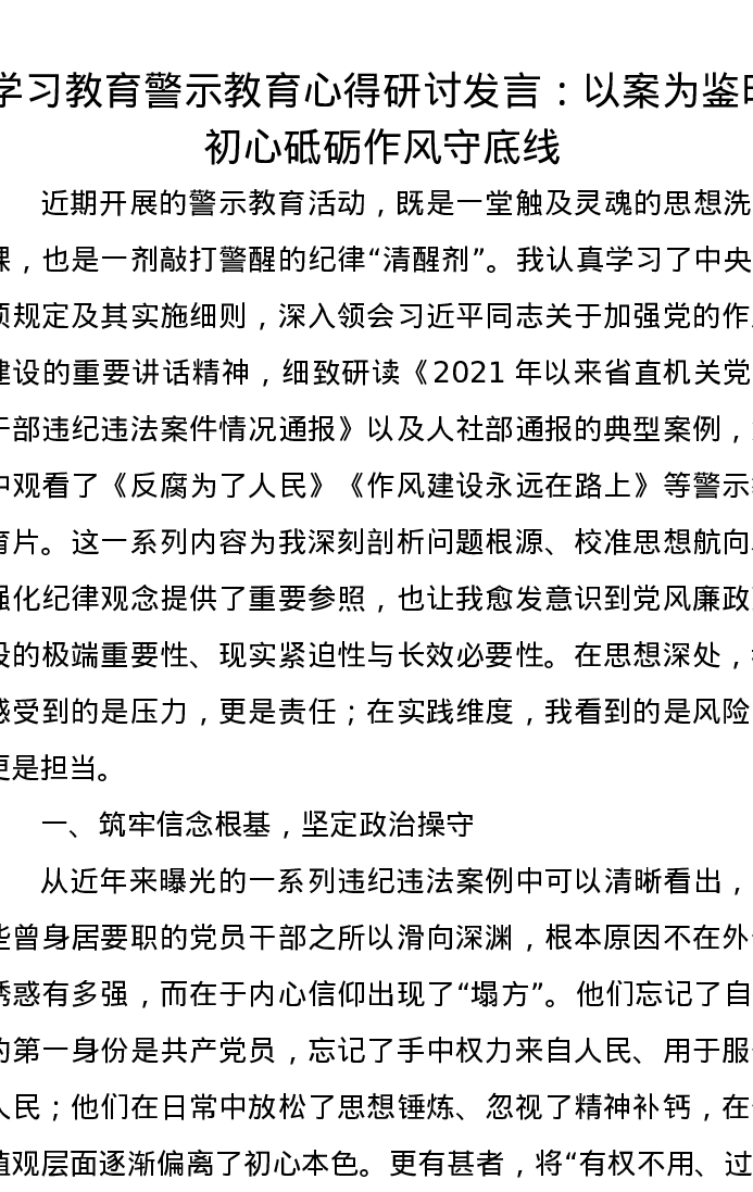 学习教育警示教育心得研讨发言:以案为鉴明初心砥砺作风守底线