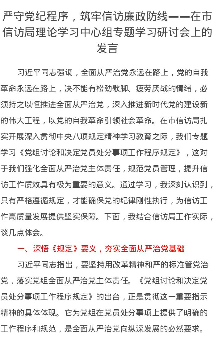 严守党纪程序,筑牢信访廉政防线——在市信访局理论学习中心组专题学习研讨会上的发言