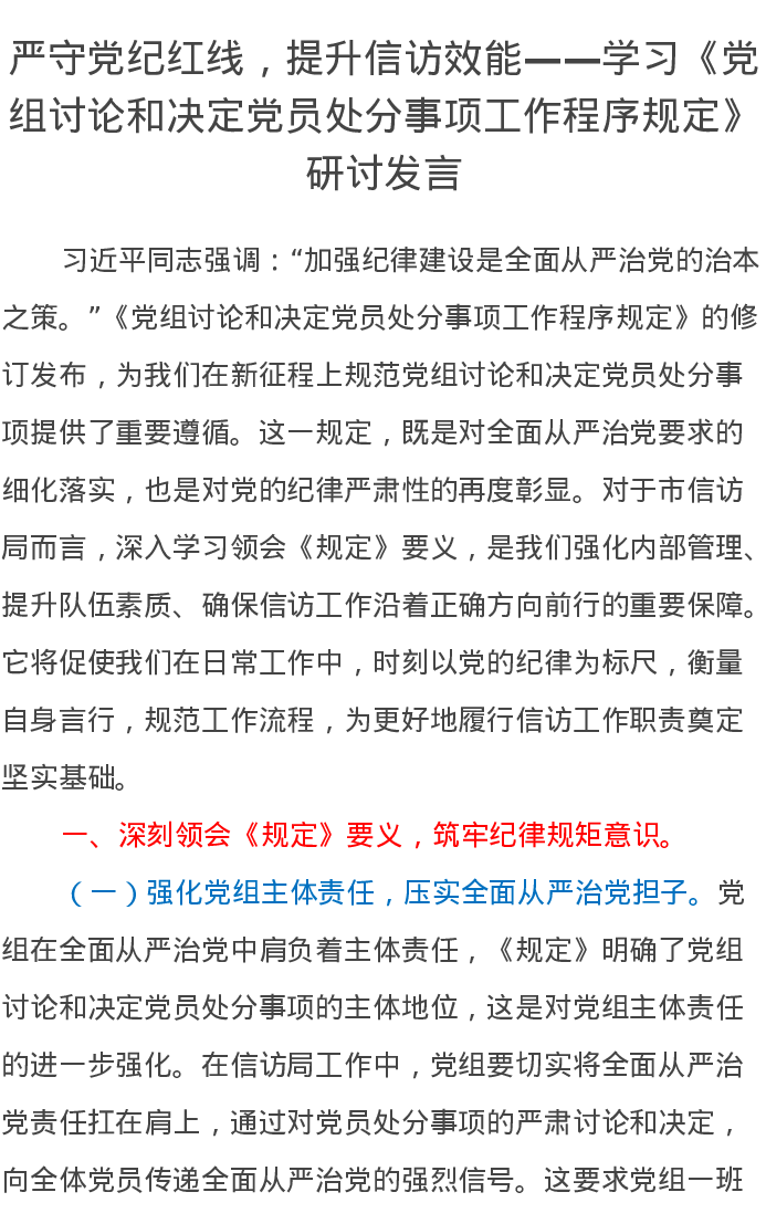 严守党纪红线,提升信访效能——学习《党组讨论和决定党员处分事项工作程序规定》研讨发言