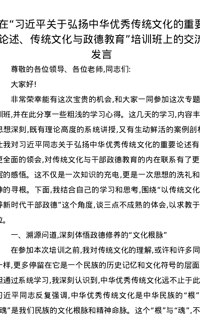 在“习近平关于弘扬中华优秀传统文化的重要论述、传统文化与政德教育”培训班上的交流发言