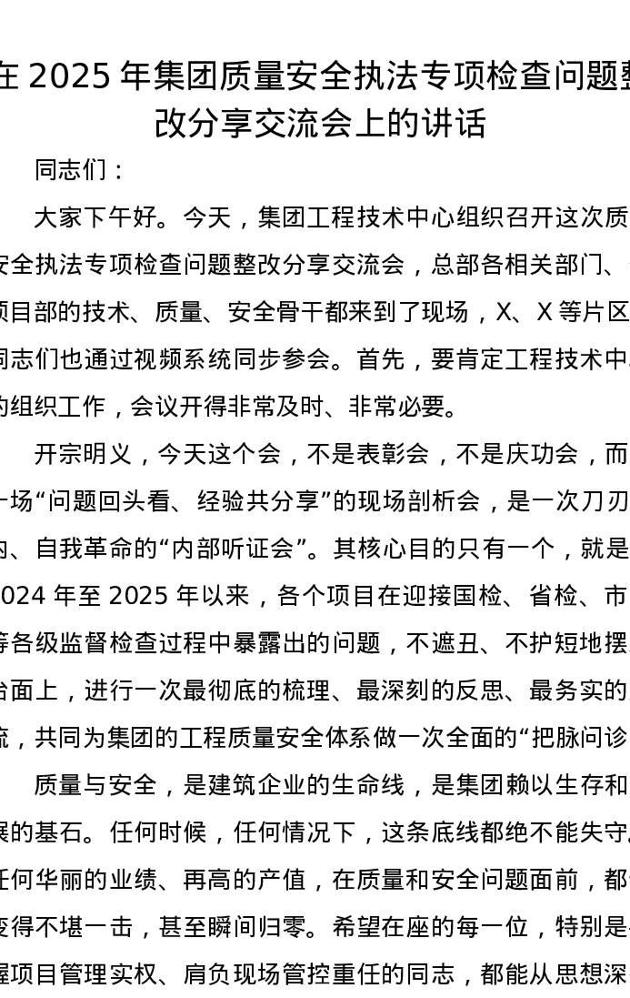 在2025年集团质量安全执法专项检查问题整改分享交流会上的讲话