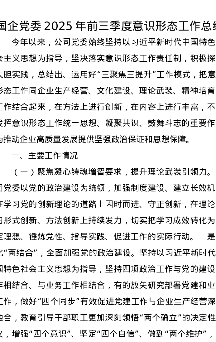 国企党委2025年前三季度意识形态工作总结