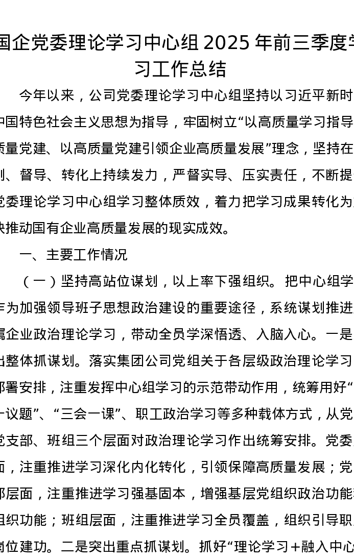 国企党委理论学习中心组2025年前三季度学习工作总结