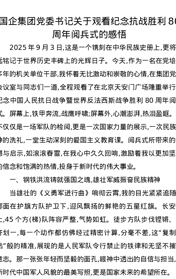 国企集团党委书记关于观看纪念抗战胜利80周年阅兵式的感悟
