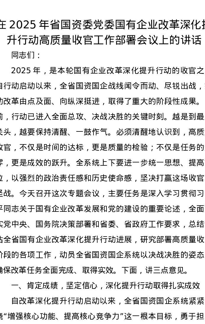 在2025年省国资委党委国有企业改革深化提升行动高质量收官工作部署会议上的讲话