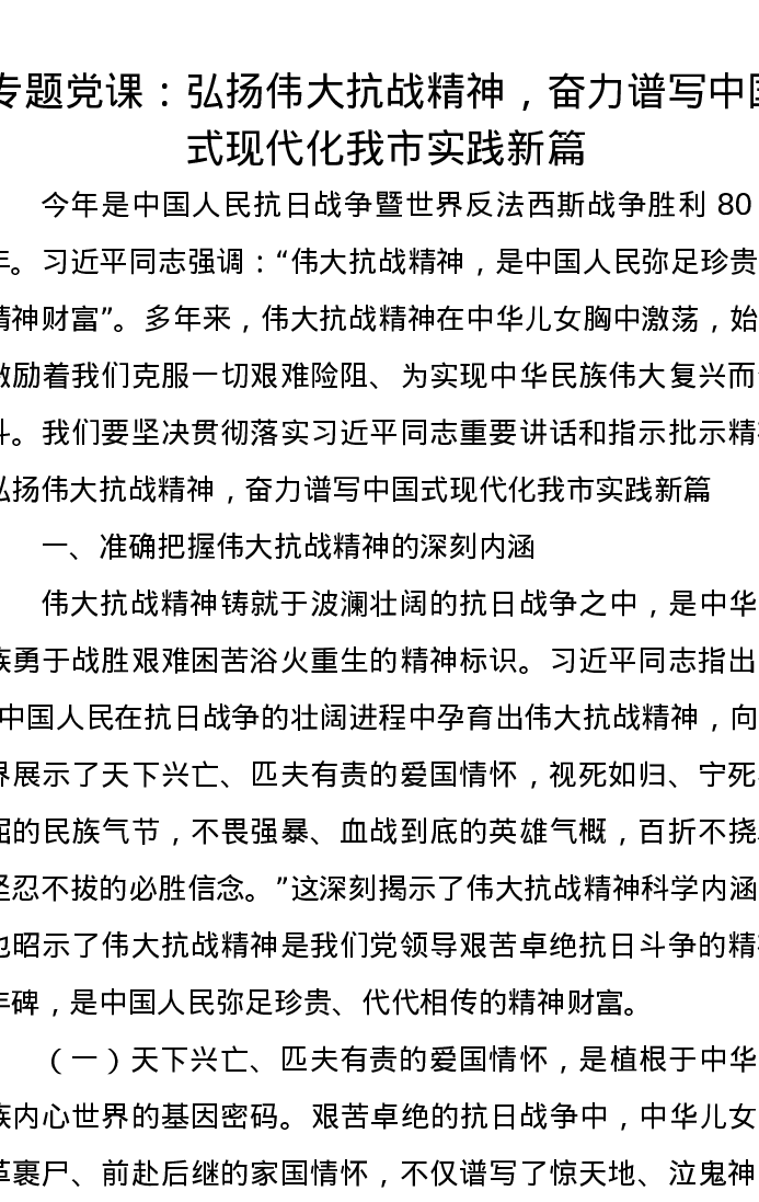 党课讲稿:弘扬伟大抗战精神,奋力谱写中国式现代化我市实践新篇