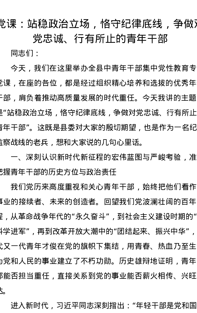 党课讲稿:站稳政治立场,恪守纪律底线,争做对党忠诚、行有所止的青年干部