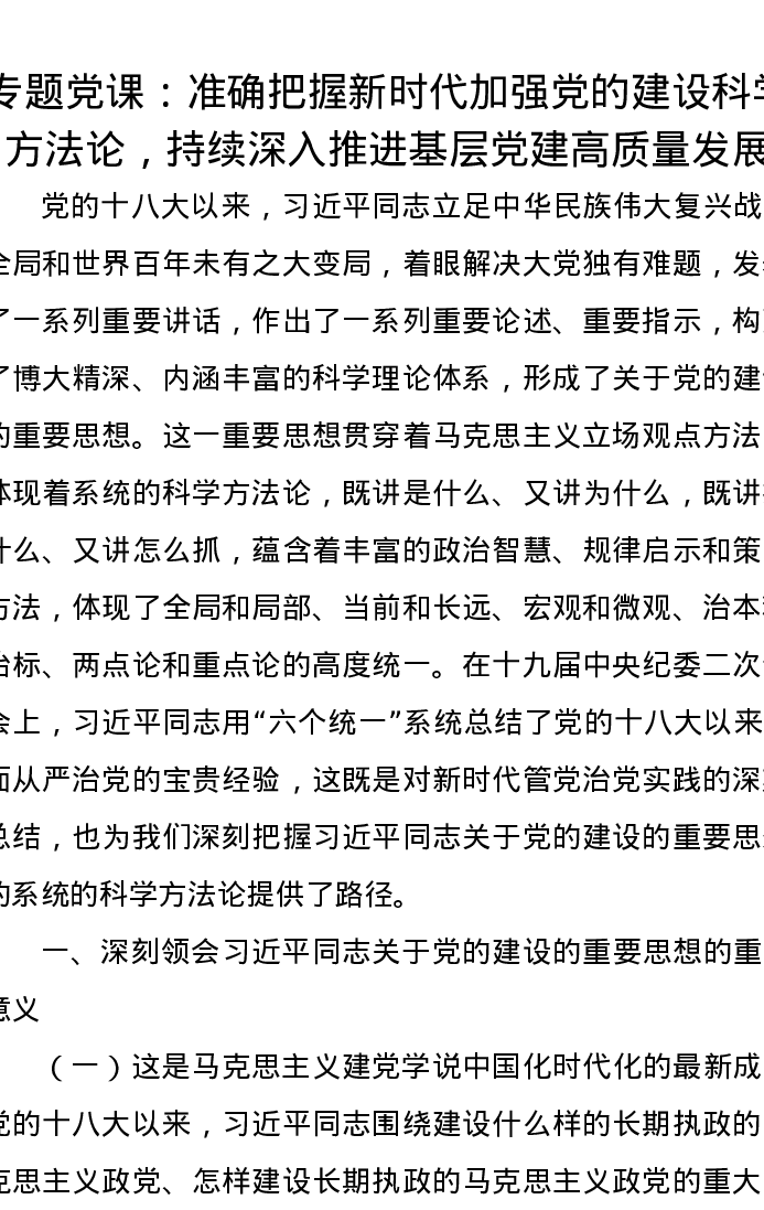 党课讲稿:准确把握新时代加强党的建设科学方法论,持续深入推进基层党建高质量发展