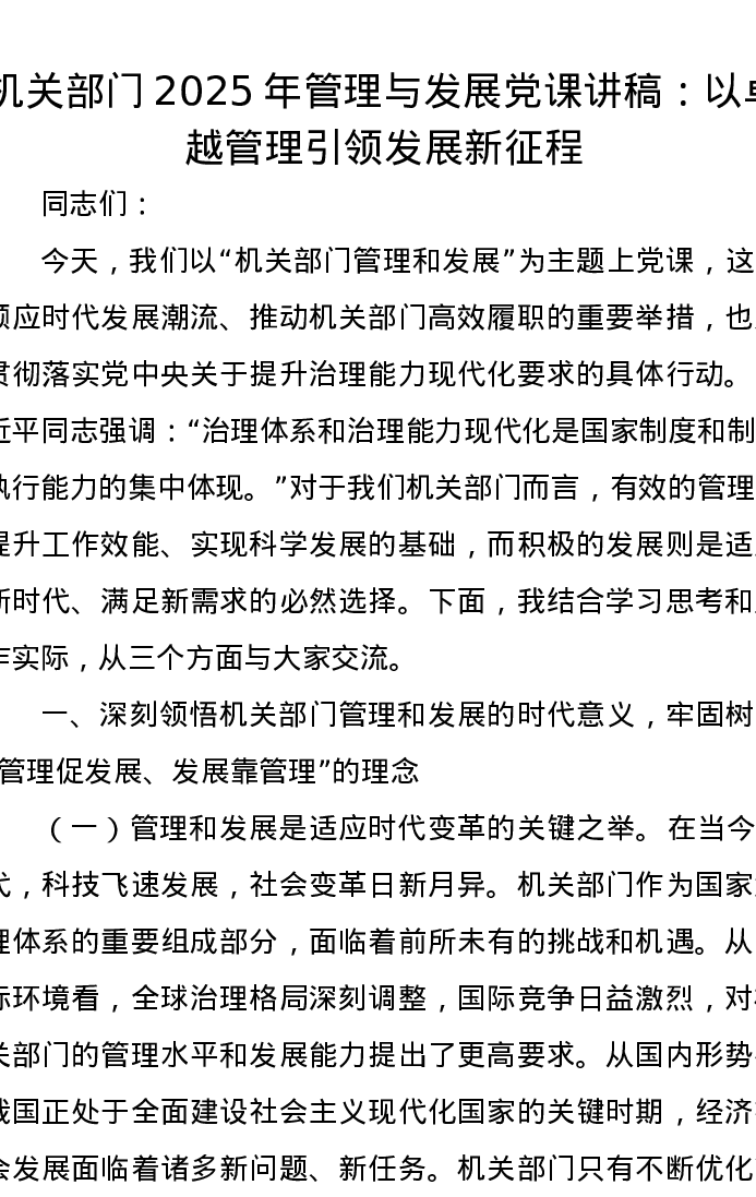 机关部门2025年管理与发展党课讲稿:以卓越管理引领发展新征程
