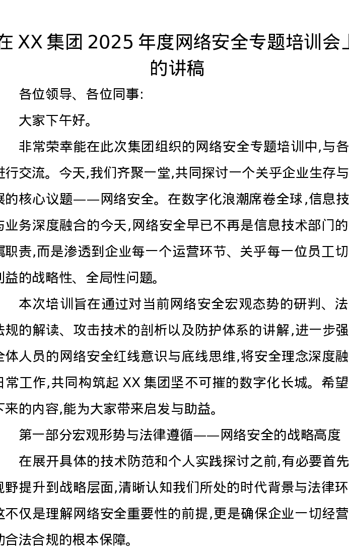 在XX集团2025年度网络安全专题培训会上的讲稿