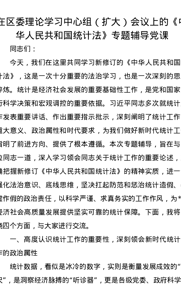 在区委理论学习中心组(扩大)会议上的《中华人民共和国统计法》专题辅导党课讲稿