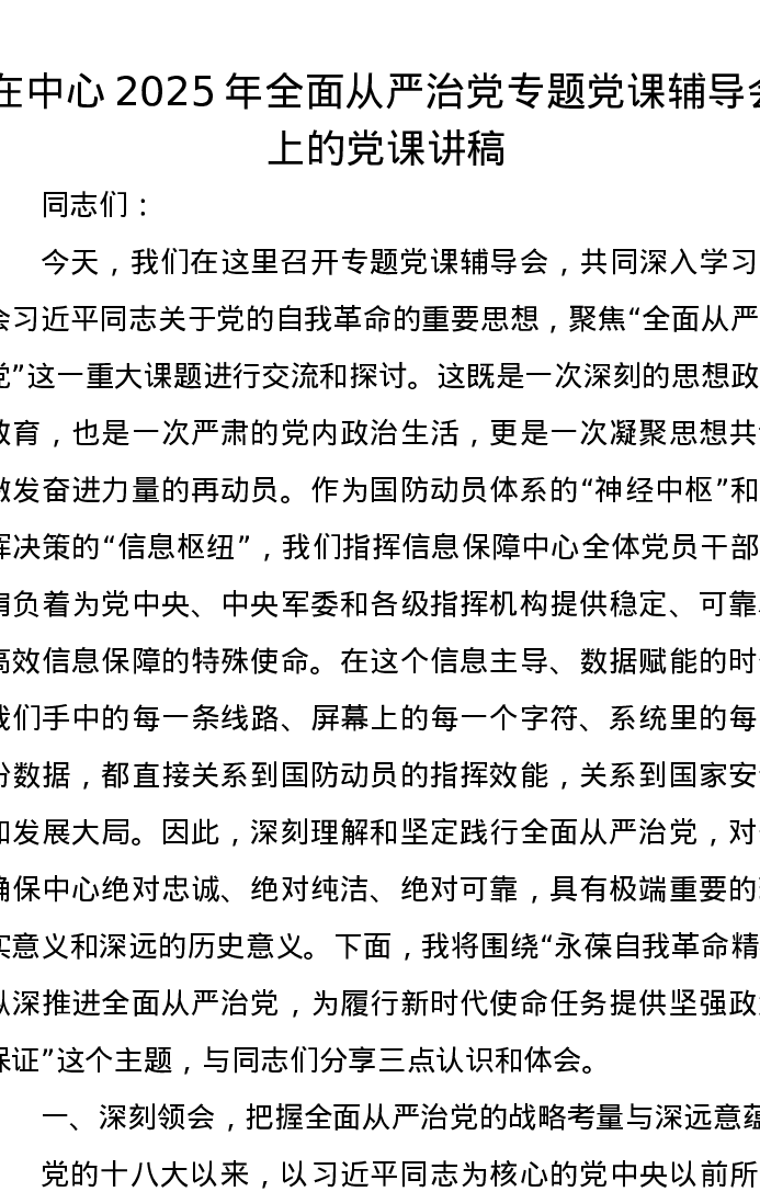 在中心2025年全面从严治党专题党课辅导会上的党课讲稿