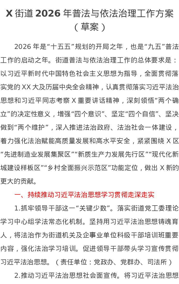 X街道2026年普法与依法治理工作方案(草案)