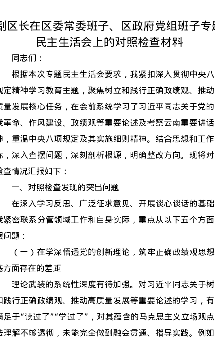 副区长在区委常委班子、区政府党组班子专题民主生活会上的对照检查材料