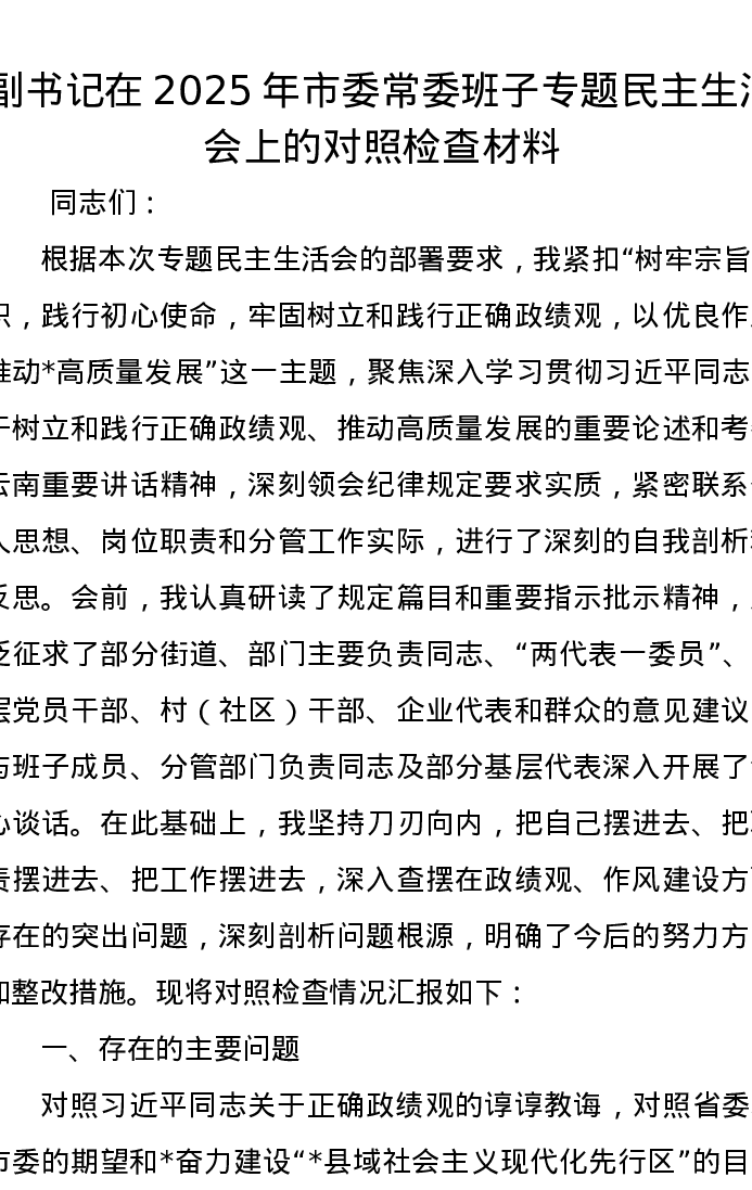 副书记在2025年市委常委班子专题民主生活会上的对照检查材料