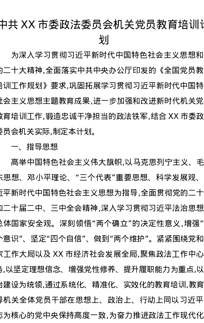 中共XX市委政法委员会机关党员教育培训计划