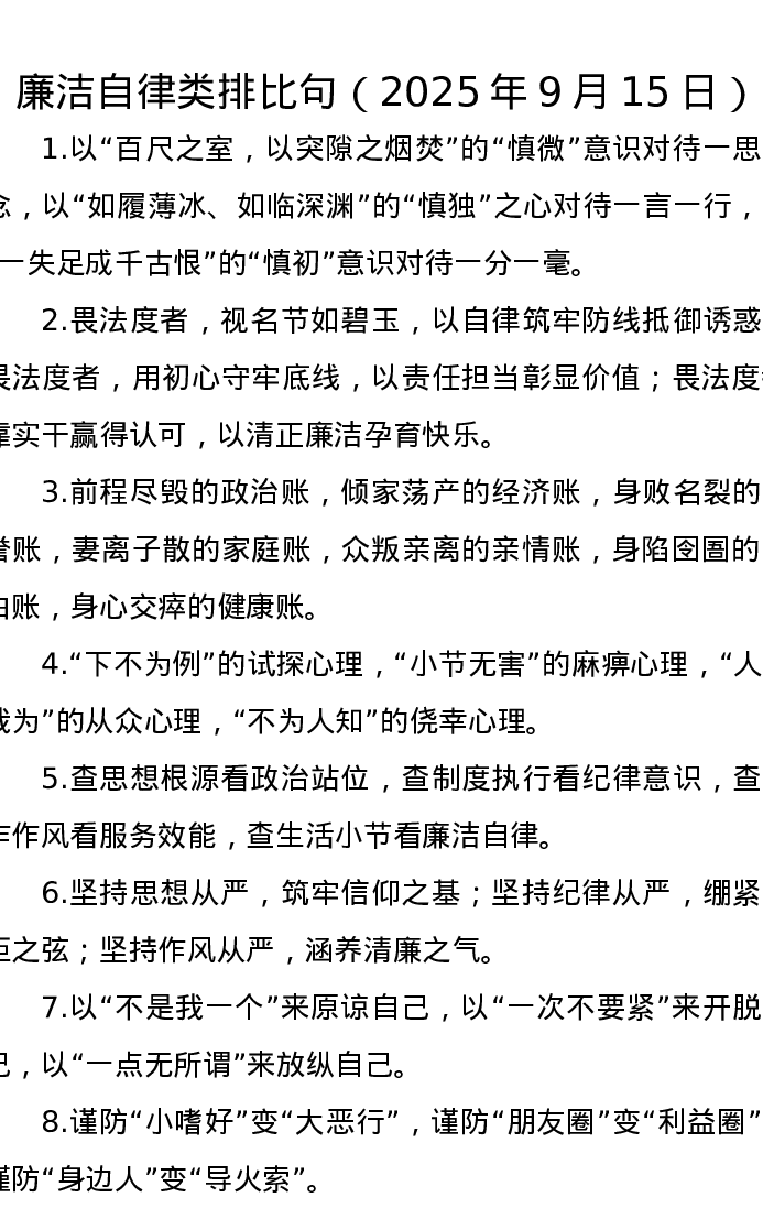 廉洁自律类排比句(2025年9月15日)