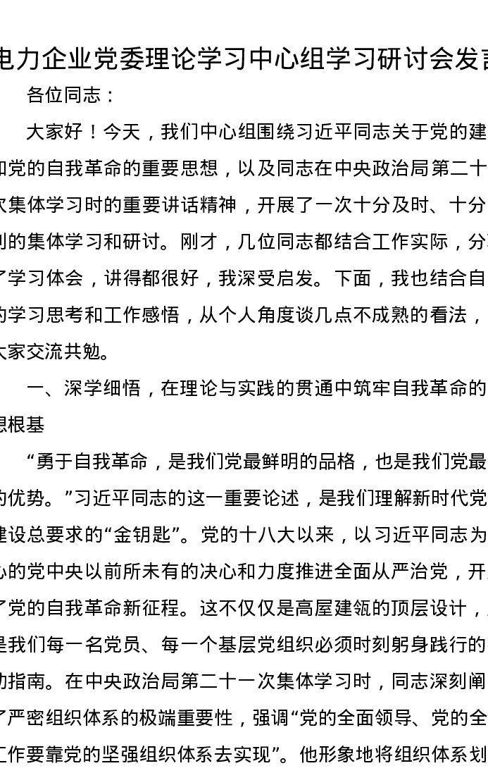 电力企业党委理论学习中心组学习研讨会发言(第二十一次集体学习)
