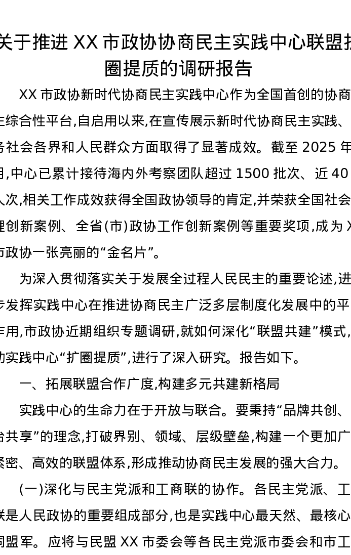 关于推进XX市政协协商民主实践中心联盟扩圈提质的调研报告