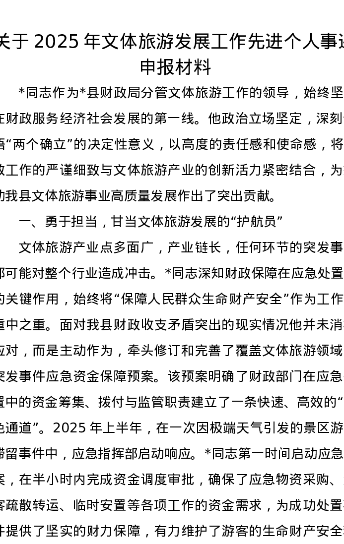 关于2025年文体旅游发展工作先进个人事迹申报材料