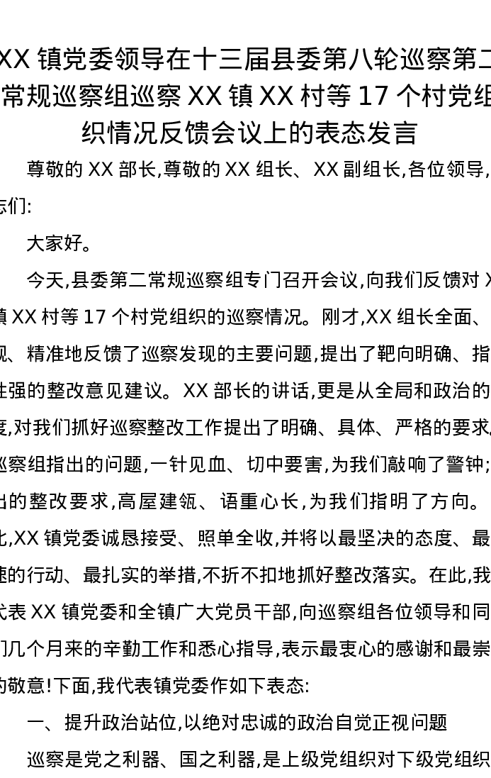 XX镇党委领导在十三届县委第八轮巡察第二常规巡察组巡察XX镇XX村等17个村党组织情况反馈会议上的表态发言