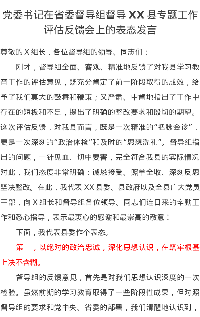 党委书记在省委督导组督导XX县专题工作评估反馈会上的表态发言