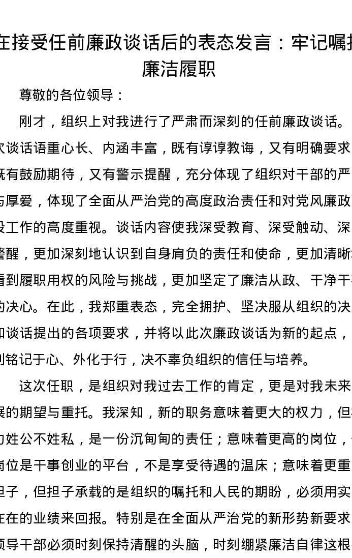 在接受任前廉政谈话后的表态发言:牢记嘱托 廉洁履职
