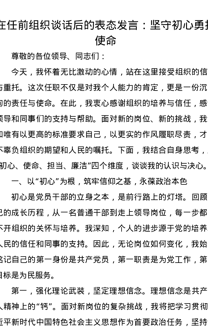 在任前组织谈话后的表态发言:坚守初心 勇担使命